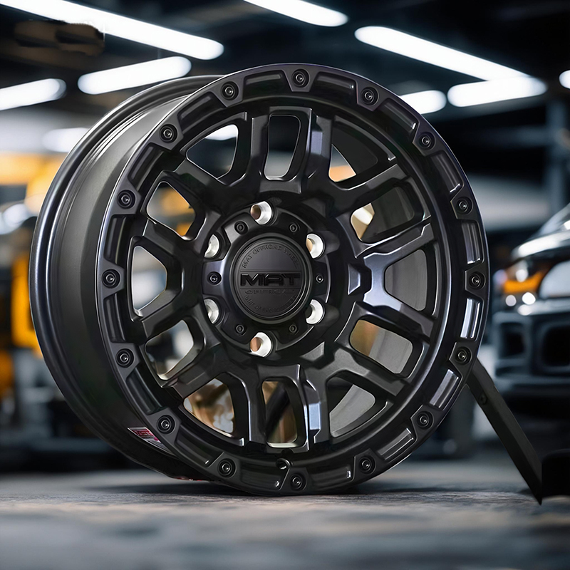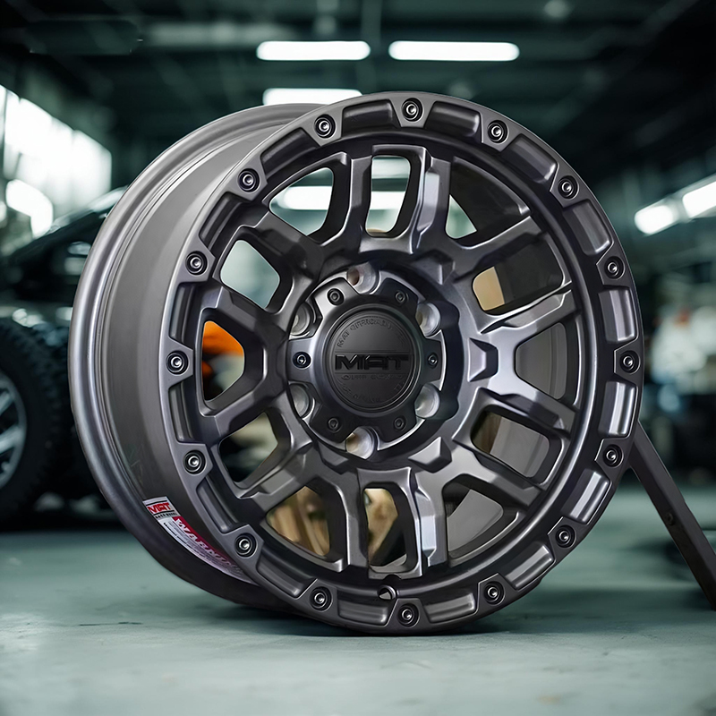 MAT轮毂 6882是最新发售的一款16寸X7J轮毂,主要适装车型吉姆尼等,U形孔设计有利于排泥沙,装饰性铆钉和凹凸不平辐条彰显粗旷强悍,颜色有亚黑,古铜色,